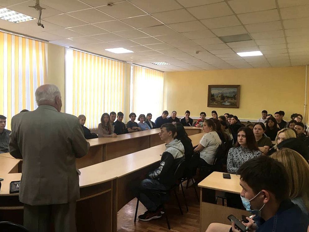 Военный комиссар рассказал о ситуации, происходящей на Украине. Также Леонид Кириллович вместе со студентами вспоминал подвиги погибших военнослужащих Харабалинского района.