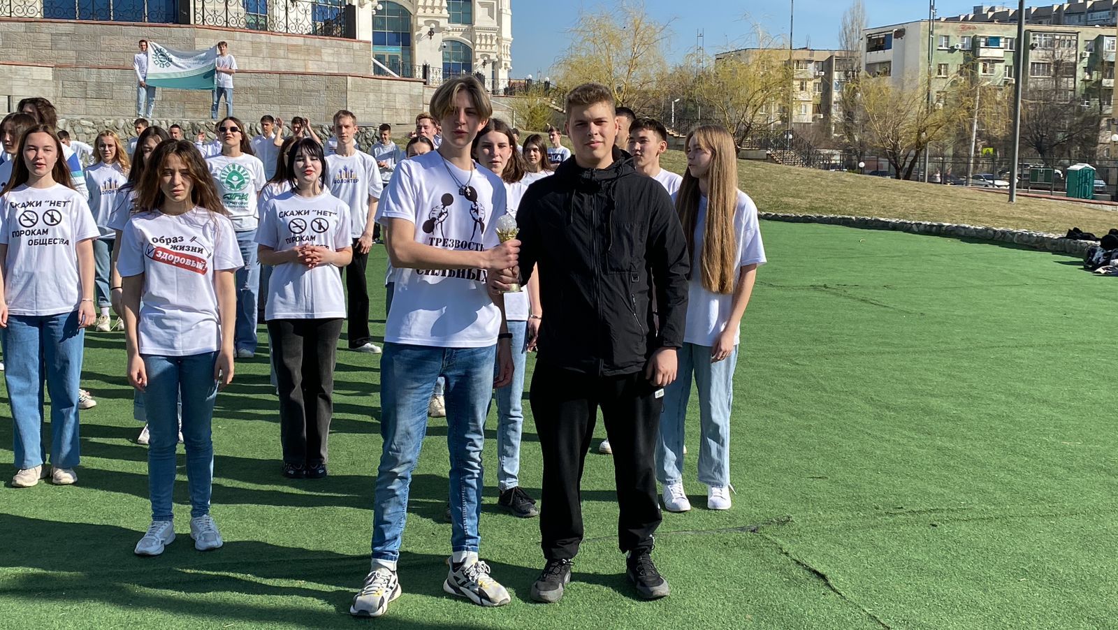 Около 60 студентов выполняли под музыку несложные физические упражнения. После зарядки ребята передали эстафету студентам Астраханского губернского техникума.