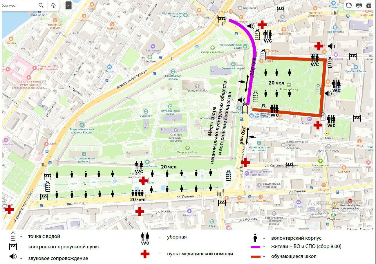 Шествие «Бессмертного полка» начнется сразу после Торжественного построения войск Астраханского гарнизона, которое начнется в 10:00. Маршрут шествия пройдет по улице Тредиаковского и повернет на улицу Ленина.