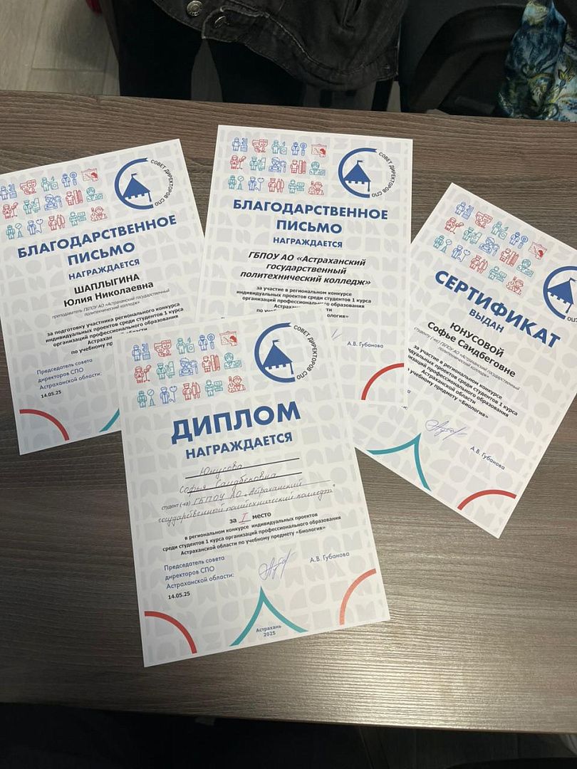 Первое место заняла студентка отделения информационных технологий, экономики и права ГБПОУ АО «Астраханский государственный политехнический колледж» Юнусова Софья, представившая свой исследовательский проект по теме «Анализ морфометрических показателей высших растений в условиях нефтяного загрязнения почвы» под руководством профессионального наставника и преподавателя Шаплыгиной Ю. Н.