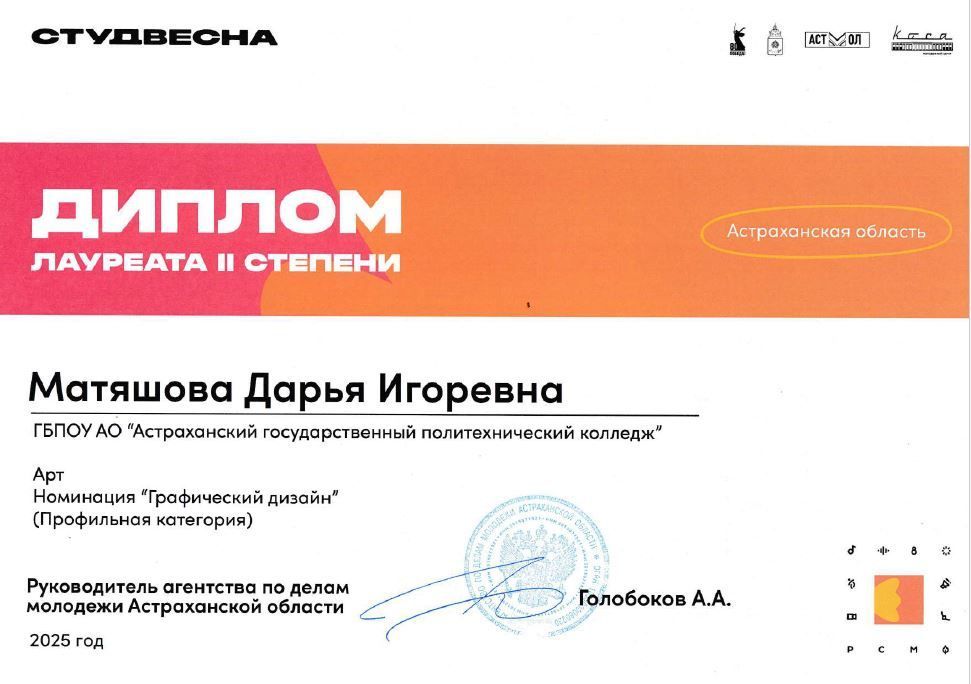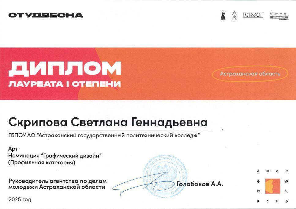 На региональном этапе в номинации «Графический дизайн» приняли участие студентки отделения информационных технологий, экономики и права Астраханского государственного политехнического колледжа» Гроцкая Анастасия (ГРД-3109), Федай Татьяна (ГРД-4209), Скрипова Светлана (ГРД-4109), Матяшова Дарья (ГРД-4109), проявившие не только творческий подход и профессионализм, но и достойно защитившие свои проекты перед жюри.
