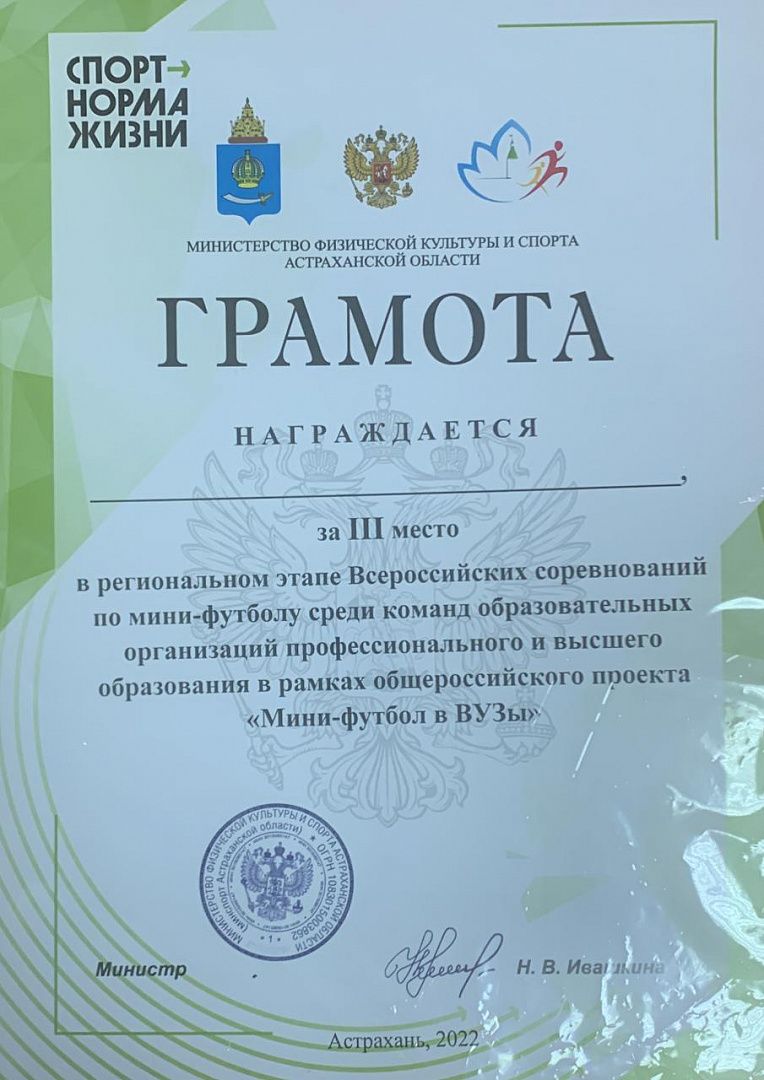 С 14 января по 11 февраля 2022 года в Астрахани прошёл региональный этап Всероссийских соревнований по мини-футболу среди команд учреждений профессионального и высшего образования. Финальные матчи состоялись во дворце спорта «Спартак». По итогам соревнований команда Астраханского государственного политехнического колледжа завоевала почётное третье место.