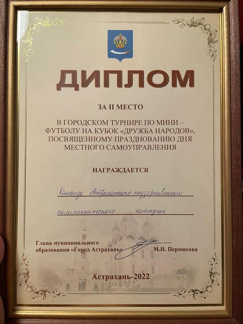 В Астрахани состоялся городской турнир по мини-футболу на кубок «Дружбы народов», приуроченный к Дню местного самоуправления. В соревнованиях приняли участие студенты средних специальных и высших учебных заведений города.