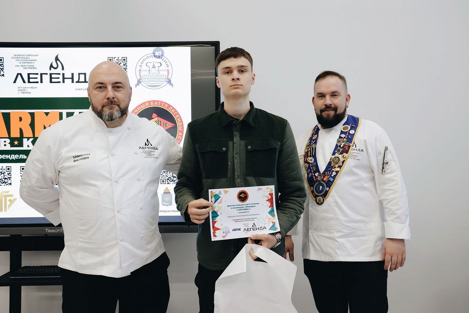 Добавим, что в рамках конкурса «Крендель» проходили отборочные этапы Всероссийской олимпиады по кулинарии и сервису «Легенда». Участники соревновались в номинациях «Шефы», «Юниоры», «Кондитеры». И здесь астраханцы также вошли в число победителей и призеров: в номинации «Шефы» первое место завоевал студент 4 курса АГПК Алексей Студеньков, в номинации «Юниоры» третье место тоже занял учащийся АГПК Александр Трушкин, а в номинации «Кондитеры» второе место у преподавателя АГПК Тамары Галкиной. Стоит отметить, что Тамара Викторовна была награждена специальным призом от Центра кулинарного искусства «Школа шоколада» Елены Сучковой – сертификатом на обучение. А Алексею Студенькову, ставшему победителем в номинации «Шефы», теперь предстоит выступить в финале Всероссийской Олимпиады по кулинарии и сервису «Легенда».