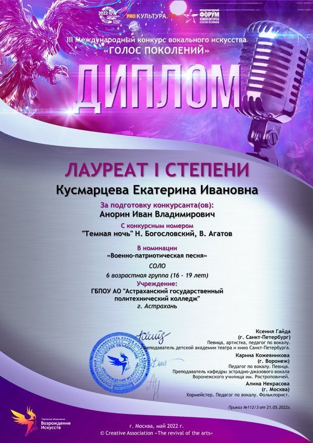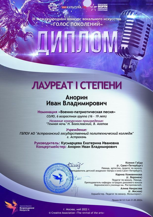 Студент группы РЭМ 1109 Анорин Иван принял участие в  III Международном конкурсе вокального мастерства "Голос поколений" (г.Москва), где в номинации "Военно - патриотическая песня" стал лауреатом I степени с песней "Тёмная ночь".