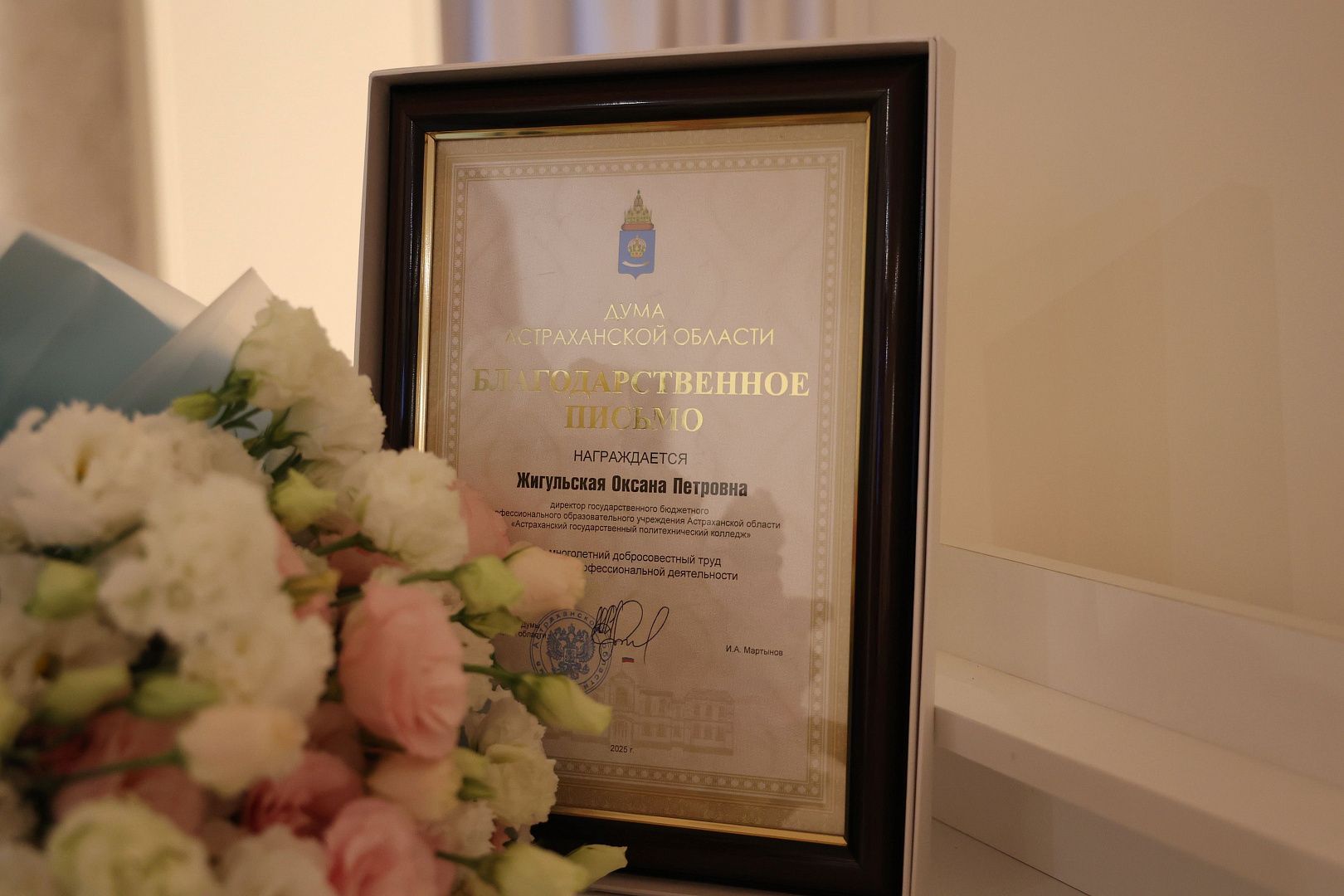 Директор Астраханского государственного политехнического колледжа Оксана Петровна Жигульская удостоена Благодарственного письма Думы Астраханской области за многолетний добросовестный труд и успехи в профессиональной деятельности.