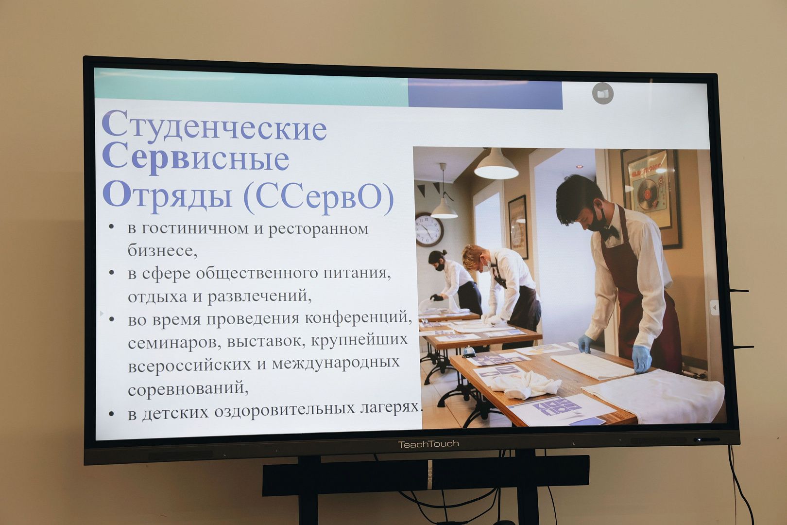 С ребятами встретились руководитель и заместитель руководителя регионального отделения Анастасия Горбунова и Анастасия Бурукина. Они рассказали ребятам о направлениях деятельности студенческих отрядов, о возможностях устроиться на работу в летний период времени либо просто найти круглогодичную подработку.