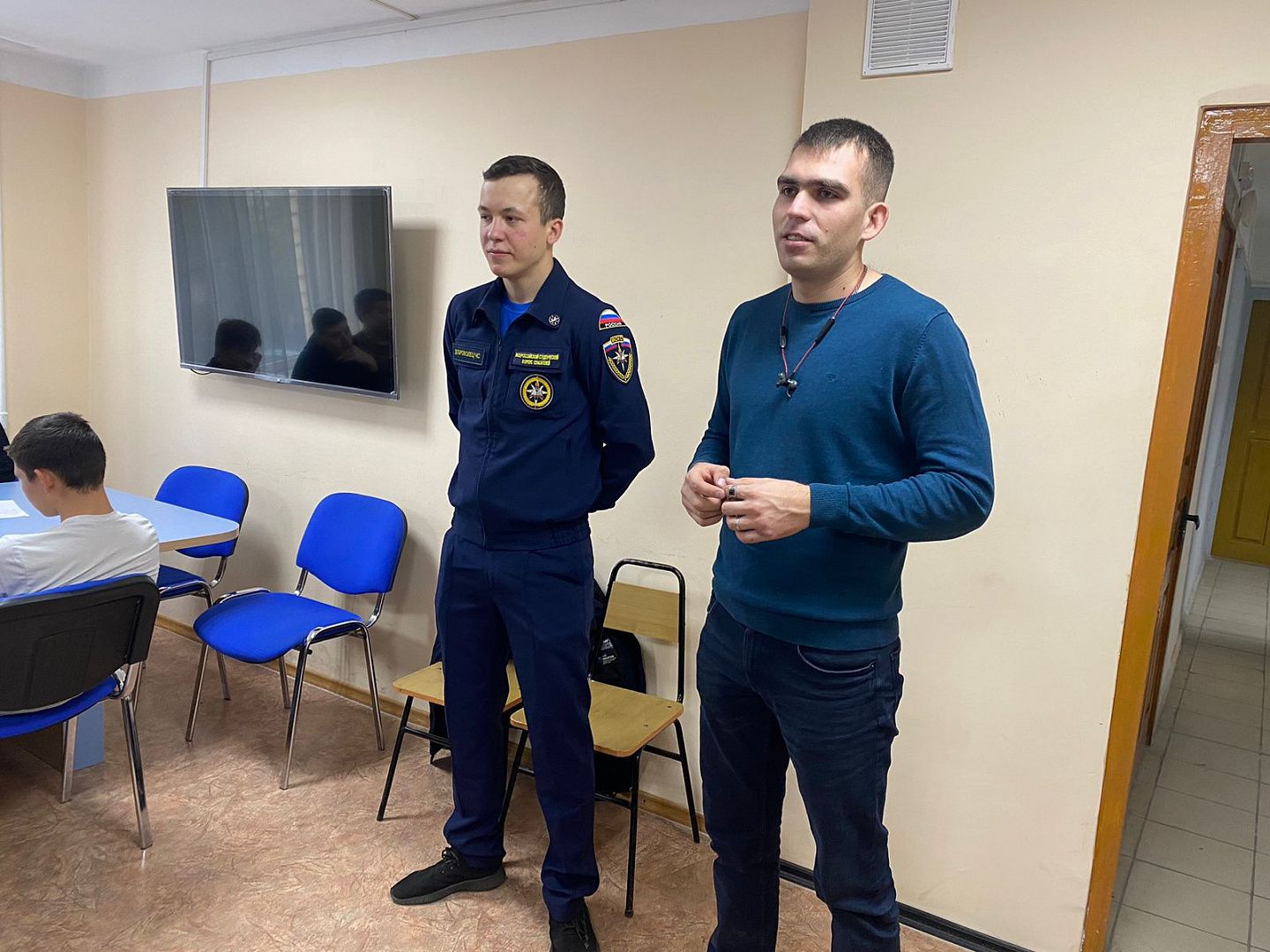 С учащимися АГПК встретились начальник отделения подготовки населения управления гражданской обороны и защиты населения Главного управления МЧС России по Астраханской области Виктор Орлов и заместитель руководителя регионального отделения Всероссийского студенческого корпуса спасателей, студент группы СЭН-401 Кирилл Фатеев.