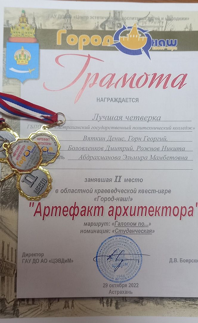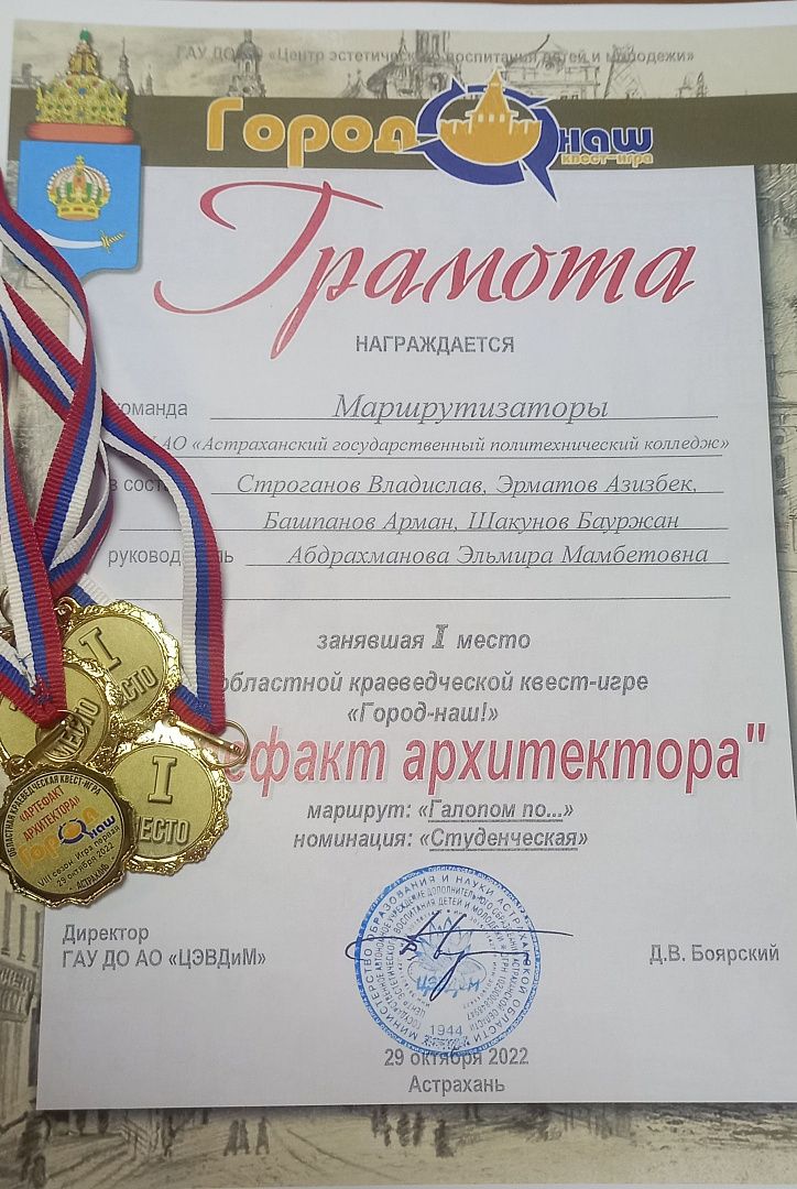 Студенты групп ССА-2109 и ССА-1109 отделения информационных технологий, экономики и права вместе с куратором Эльмирой Мамбетовной Абдрахмановой приняли участие в областной краеведческой квест-игре «Город - наш!». Первая игра VIII сезона называлась «Артефакт архитектора». Участникам предстояло решить краеведческие задачи, в которых загаданы локации, затем построить по ним маршрут и пройти его.
