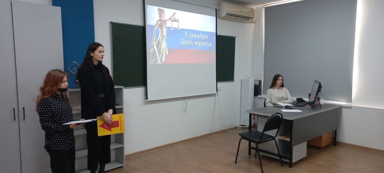 В преддверии праздника на отделении информационных технологий, экономики и права для студентов, обучающихся по специальности «Право и организация социального обеспечения» было проведено мероприятие «Именем закона». Оно было подготовлено преподавателем специальных дисциплин Натальей Владимировной Кузичкиной и студентами группы ПСО-2401 Майей Ковалевой, Викторией Сидоренко, Дарьей Масютиной и имело профессиональную направленность.