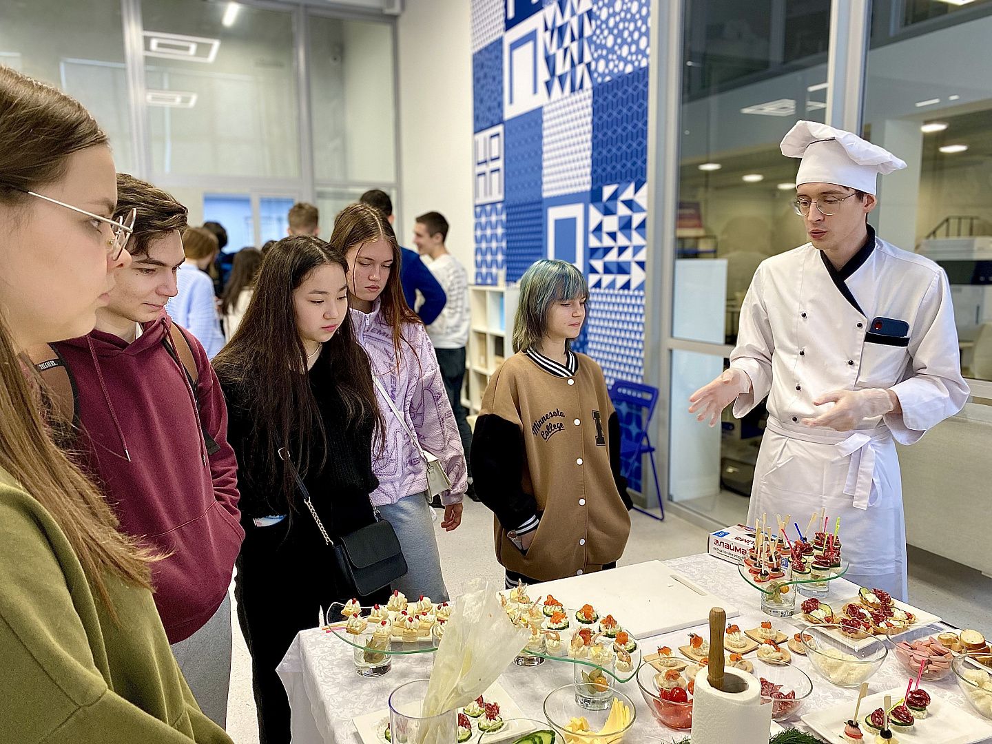 Для школьников наши студенты подготовили различные мастер-классы по приготовлению и оформлению закусок, изготовлению макетов дизайнерской мебели, организации работы в гостинице, исследованию экологической ситуации территории. Студенты также продемонстрировали ребятам работу сварочного аппарата и ультразвуковое исследование сварных соединений, а также показали опыты в работе товароведа-эксперта.  Кроме того, для школьников провели виртуальную экскурсию с викториной и рассказали о работе с учебным складом.