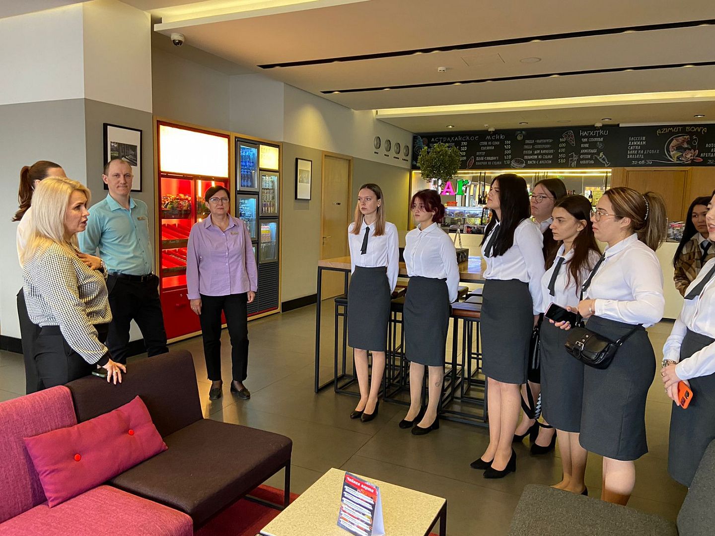 Студенты выпускных групп ГД-416 и ТУ-423 отделения сервисных технологий и дизайна побывали на экскурсии в отеле «Азимут». Ребят сопровождали преподаватель Земфира Владимировна Кульпинова и специалист Центра занятости населения г. Астрахань.