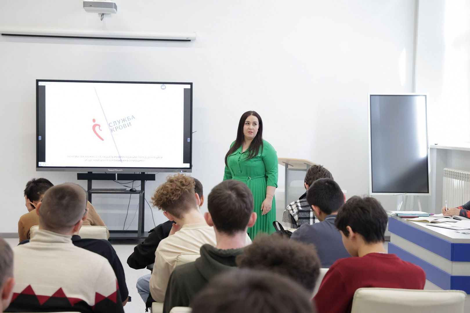 Специалист центра крови показала ребятам презентации с правилами подготовки к донации.