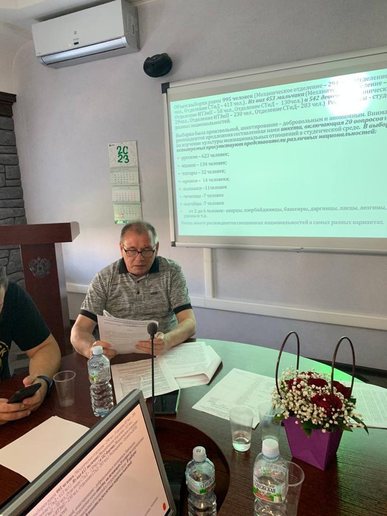 В рамках проведения круглого стола выступил педагог-психолог нашего колледжа Швецов А.В. В феврале 2023 года социально-психологической службой нашего колледжа проводилось социологическое исследование на тему: «Проблемы межнациональных отношений в Астраханском государственном политехническом колледже». Александр Витальевич рассказал о ходе проведения исследования и ознакомил всех участников с результатами опроса.
