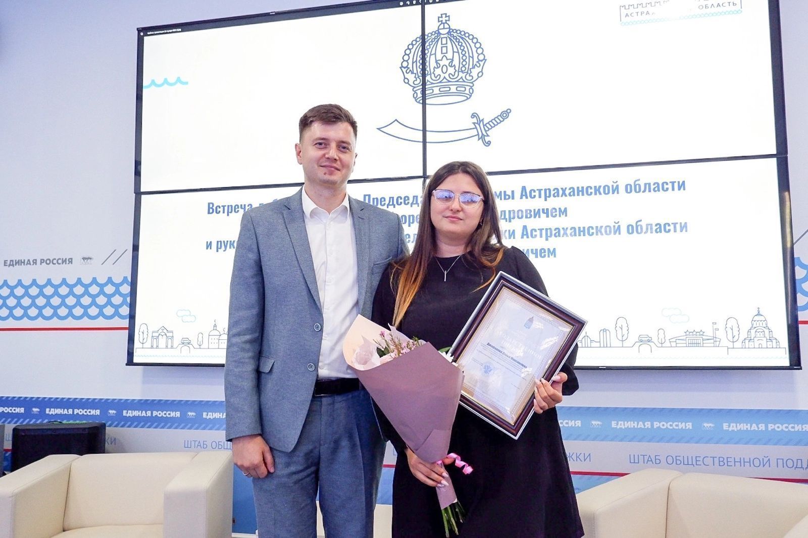 В ходе встречи прошло награждение самых активных общественных объединений. Преподаватель Астраханского государственного политехнического колледжа, руководитель волонтёрского отряда «Доброе сердце» Дарья Максимовна Джафарова была отмечена благодарственным письмом Думы Астраханской области за добросовестный труд и активную общественную деятельность.