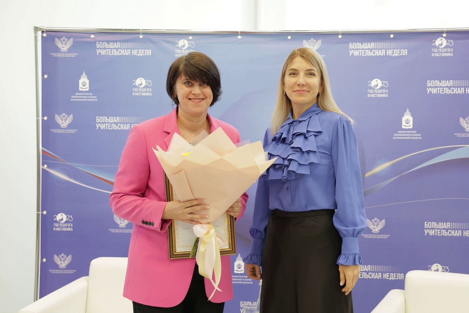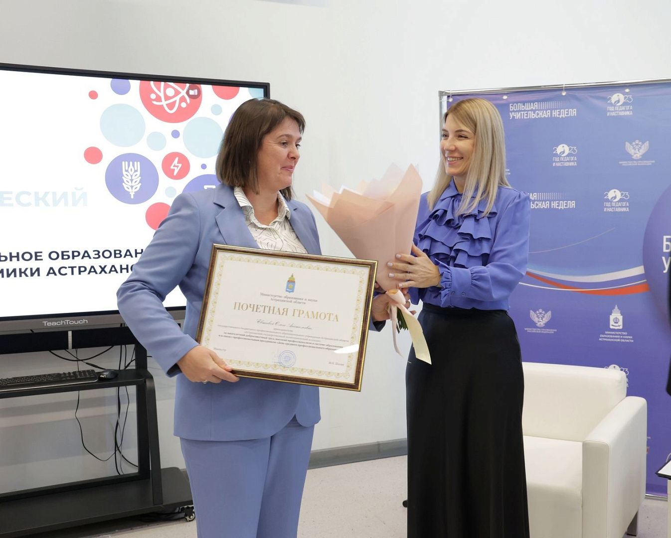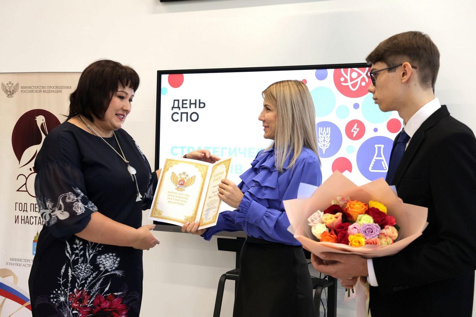 Встреча завершилась торжественной церемонией награждения работников среднего профессионального образования. Мастерам производственного обучения и преподавателям вручили Почетные грамоты Министерства просвещения Российской Федерации и министерства образования и науки Астраханской области. Среди награждённых – преподаватель Лиманского филиала АГПК Ольга Анатольевна Евтеева.
