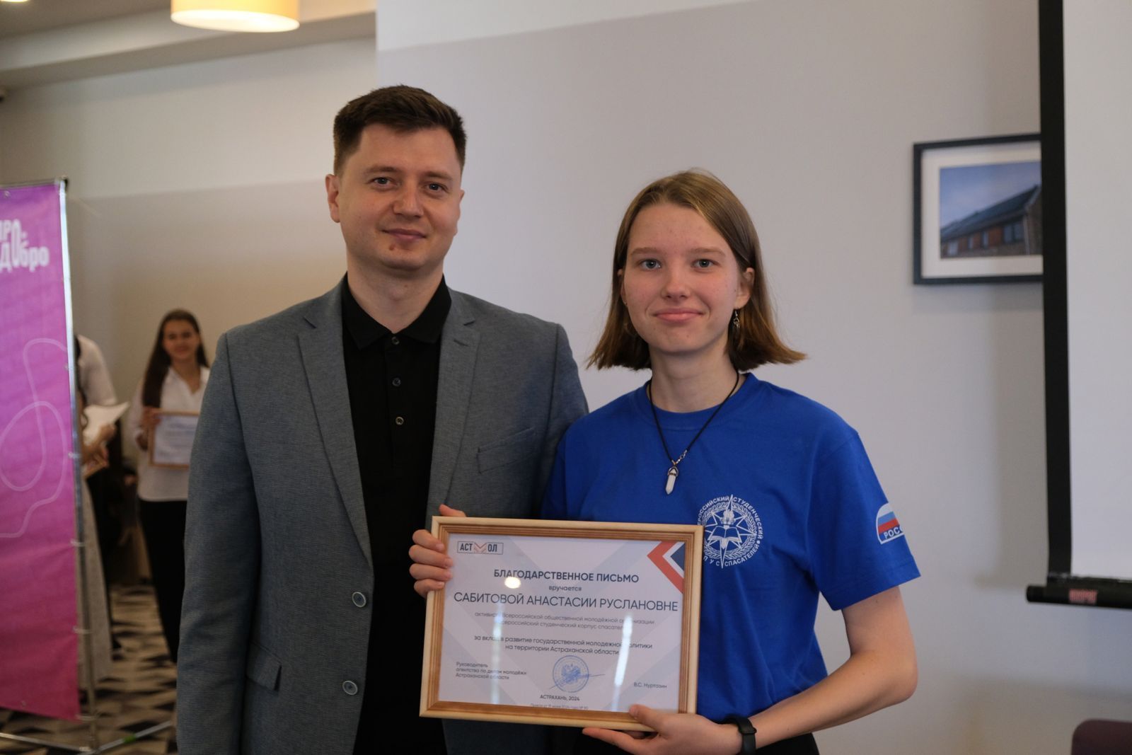 В рамках праздничного мероприятия прошла торжественная церемония награждения активных и талантливых молодых людей. Студентка АГПК Анастасия Сабитова была отмечена Благодарственным письмом агентства по делам молодёжи Астраханской области за вклад в развитие государственной молодёжной политики на территории региона.