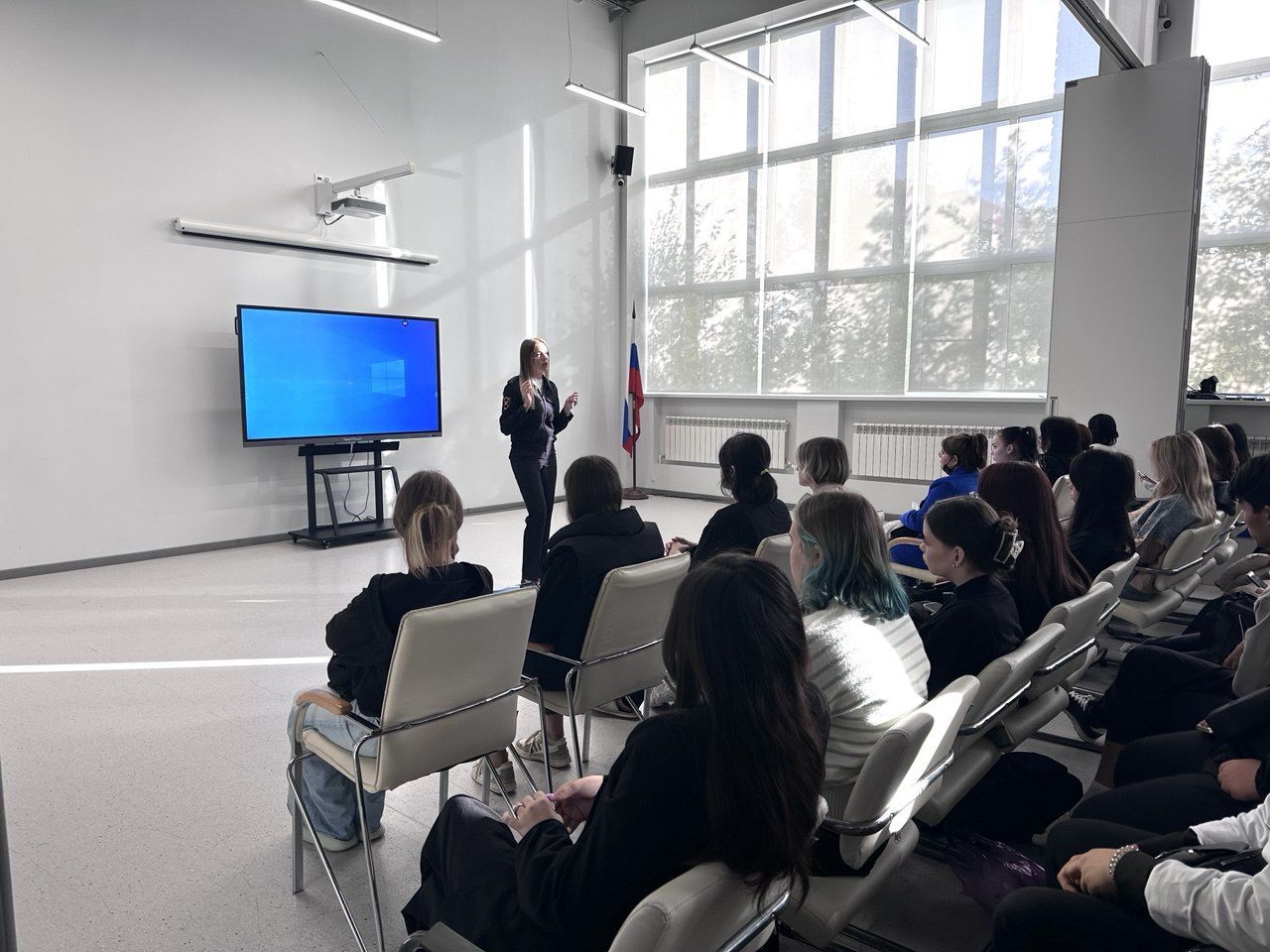Капитан полиции акцентировала внимание студентов на том, что использование наушников с музыкой и мобильного телефона недопустимо при переходе проезжей части дороги.