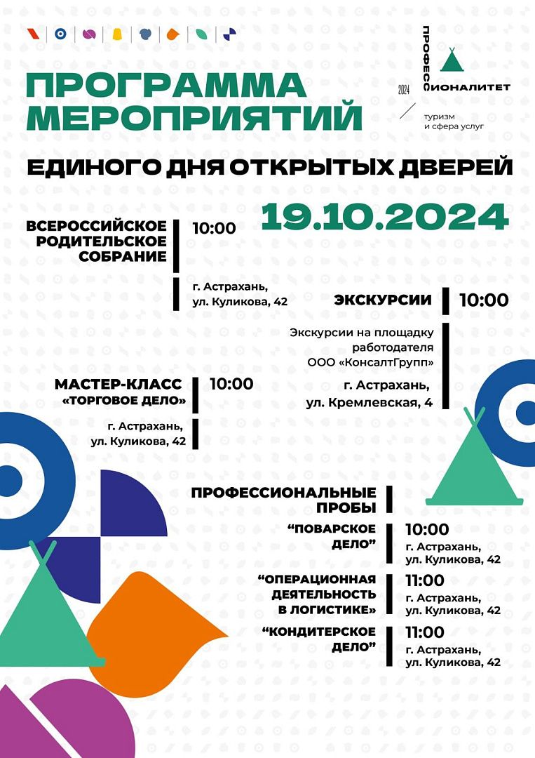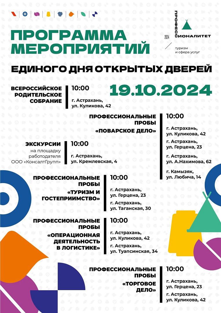 19 октября 2024 года на территории всей страны состоится Единый день открытых дверей в рамках федерального проекта «Профессионалитет». Астраханская область также участвует в этом масштабном событии.
