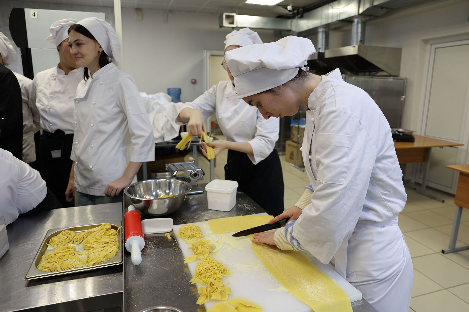 Мастер-класс был посвящен одному из самых любимых блюд во всем мире – пасте. Шеф-повар поделился секретами приготовления идеального теста для пасты, рассказав о разных видах муки, воде, и о том, как добиться правильной консистенции. Студенты с интересом наблюдали за демонстрацией разных видов нарезки пасты – от классических спагетти и фетучини до экзотических тальятелле и паппарделле.