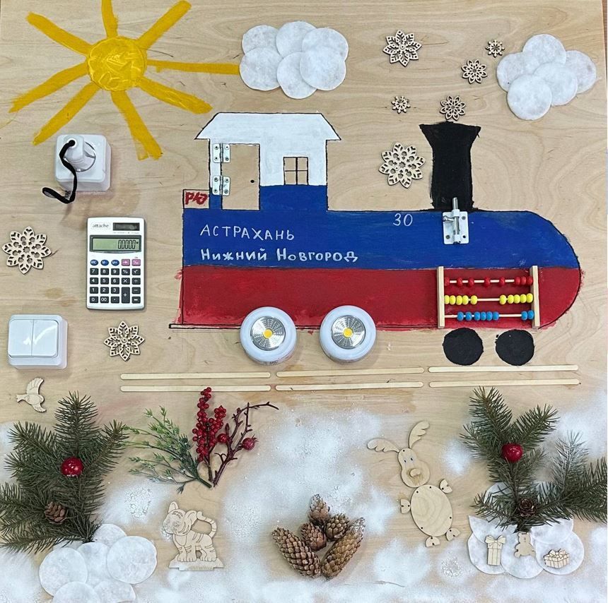 На конкурсном задании «Первые из политеха» изготавливали бизиборд для детей и тех, кому нужна реабилитация. Основой проекта стал поезд, который везёт пассажиров в новогоднее путешествие из Астрахани в Нижний Новгород.