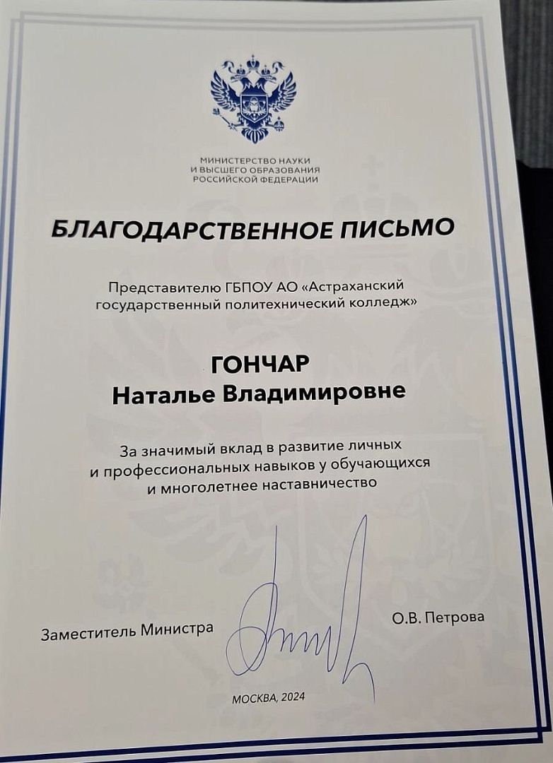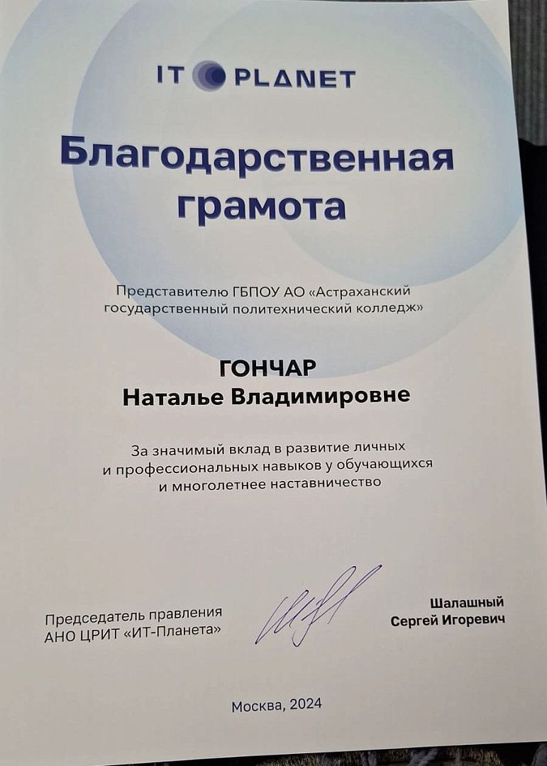 Отметим, что команда политехнического колледжа более 15 лет ежегодно принимает участие в соревнованиях Международной олимпиады «IT-Планета». За значимый вклад в развитие личных и профессиональных навыков у обучающихся и многолетнее наставничество Благодарственной грамотой правления «ИТ-Планета» и Благодарственным письмом Министерства науки и высшего образования Российской Федерации была награждена Наталья Владимировна Гончар.
