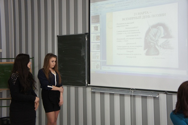 Студенты специальности Гостиничный сервис с интересом участвовали в дискуссии, где поднимались актуальные вопросы современной поэзии. Каждый раз, по-новому ставя вопрос о том, как мы пользуемся словами и нашими представлениями о вещах, как мы воспринимаем и как понимаем этот мир. Благодаря своим ассоциациям, метафорам, собственному грамматическому строю, язык поэзии, возможно, являет собой еще одно отражение общения между культурами. Способствуя многообразию в диалоге, свободному распространению идей словом, творчеству и новаторству, Всемирный день поэзии, несомненно, является также своеобразным приглашением поразмыслить над силой языка и развитием творческих возможностей каждого человека.