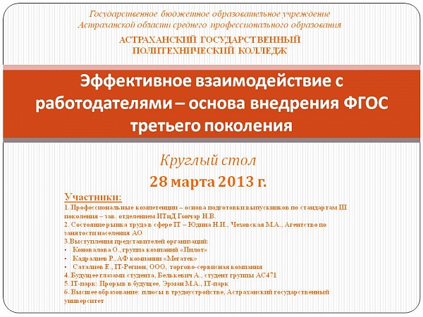 28 марта в Астраханском государственном политехническом колледже состоялся круглый стол на тему: «Эффективное взаимодействие с работодателями – основа внедрения ФГОС третьего поколения», в котором представители бизнеса, руководство, преподаватели и студенты отделения информационных технологий и дизайна обсудили пути дальнейшего взаимодействия.