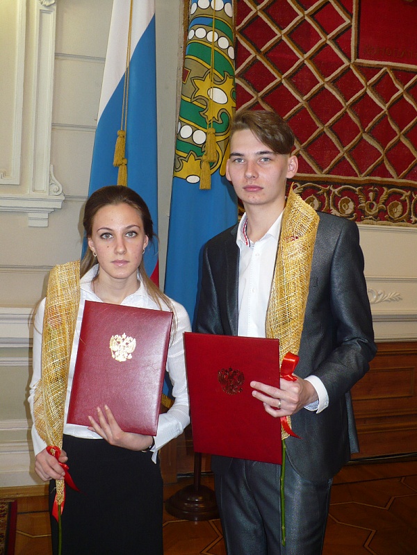 Двое наших студентов получили из рук губернатора заслуженные Свидетельства о назначении стипендии – Асадулин Юрий студент гр. АС-471, Иванова Анна студентка группы ТЭ-214.