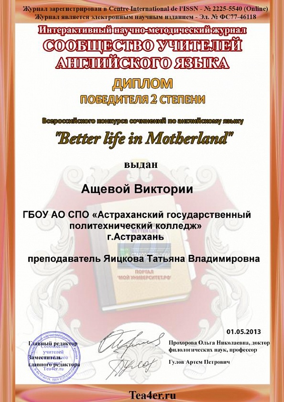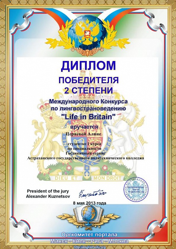 Студенты ОТДЕЛЕНИЯ СЕРВИСНЫХ ТЕХНОЛОГИЙ приняли активное участие во Всероссийском конкурсе сочинений по английскому языку «Better life in Motherland» и Международном конкурсе по лингвострановедению «Life in Britain». Наши студенты показали отличные практические знания по английскому языку и заняли следующие призовые места: