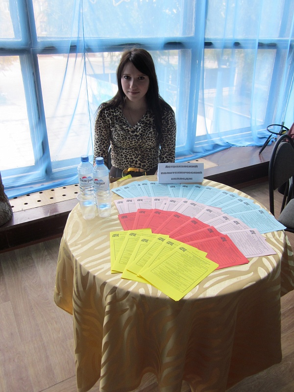 Астраханский государственный политехнический колледж представляла агитационная бригада «Сделай свой выбор» (руководитель Расторгуева И.М.). Её участники в театрализованной форме «о специальностях рассказывали, песни пели и фильмы показывали». Агитбригада содержала информацию о колледже, его отделениях и профессиях, которые выпускники школ смогут получить. Яркое незабываемое выступление никого не оставило равнодушным.