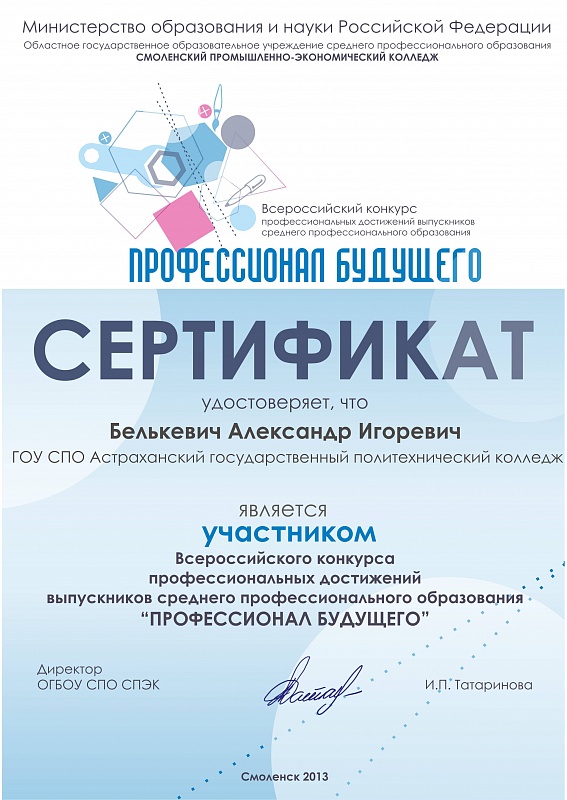 Всероссийский конкурс профессиональных достижений выпускников среднего профессионального образования «Профессионал будущего», который проводился в октябре 2013 года на базе Смоленского промышленно-экономического колледжа, был призван пропагандировать мотивацию студентов к успешной деятельности, формировать активную жизненную позицию, понимание требований современного работодателя и развитие навыков рефлексивной и оценочной (самооценочной) деятельности.