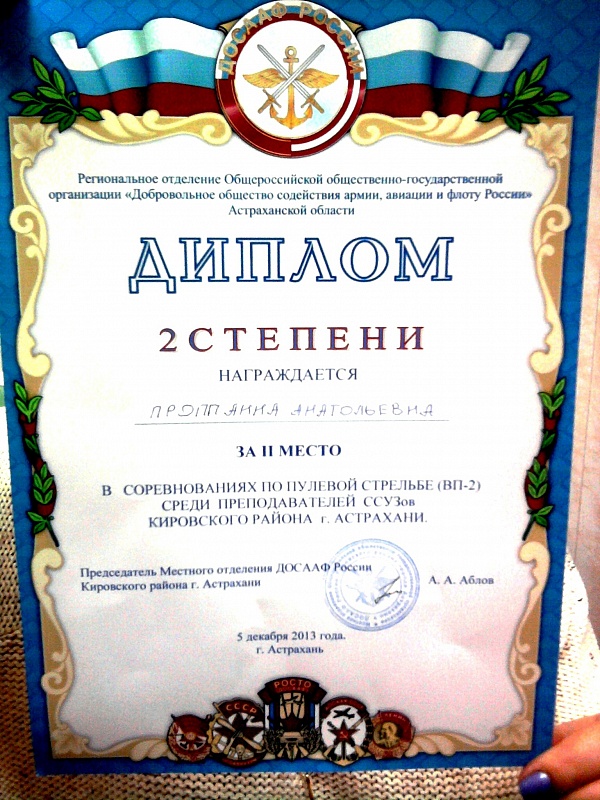 Наблюдения показывают, что в ответственных соревнованиях стрелки - женщины выступают более надёжно, чем мужчины. И это доказала преподаватель колледжа Анна Анатольевна Пропп. Стрелок – это тот, кто умеет стрелять из оружия. И Анна Анатольевна это умеет. По результатам соревнований она заняла II место среди всех участников.
