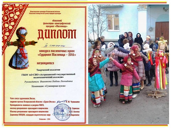 В Областном методическом центре народной культуры накануне масленичных гуляний прошел конкурс ростовой и сувенирной кукол. Студенты отделения информационных технологий и дизайна приняли активное участие в конкурсе, представив композицию «Масленица», состоящую из более чем 12 сувенирных кукол. По результатам конкурса команде колледжа присуждено почетное III место, а все студенты специальности «Дизайн» получили дипломы участников конкурса.