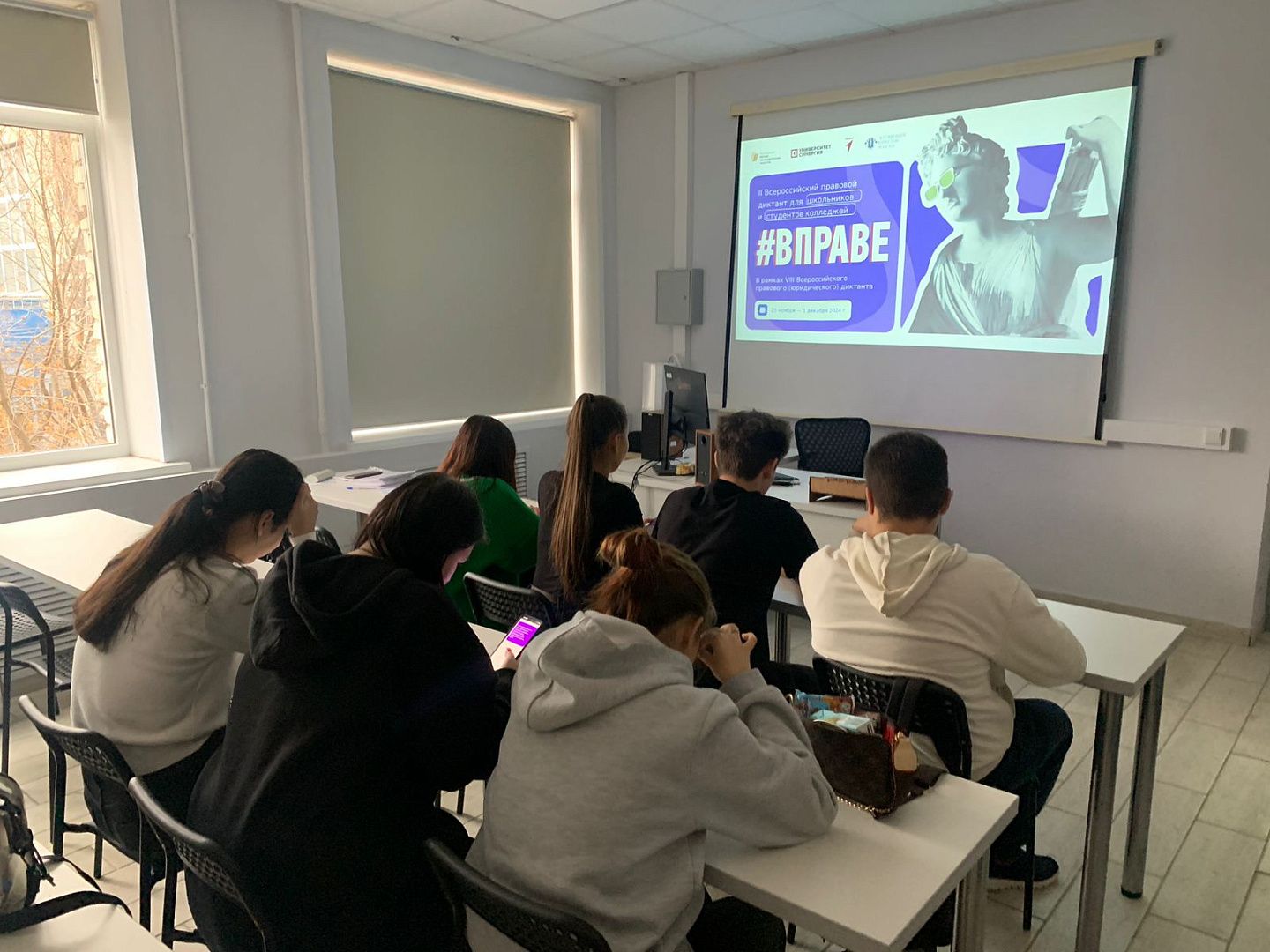 Студенты механического отделения из группы ЭБК-2109 (куратор Анна Владимировна Кушнир) и отделения информационных технологий, экономики и права из группы ПСО-3109 (куратор Инна Владимировна Даниелян) приняли участие во II Всероссийском правовом диктанте #ВПРАВЕ. Они разбирались с тонкостями правоприменения и нюансами законодательных актов.