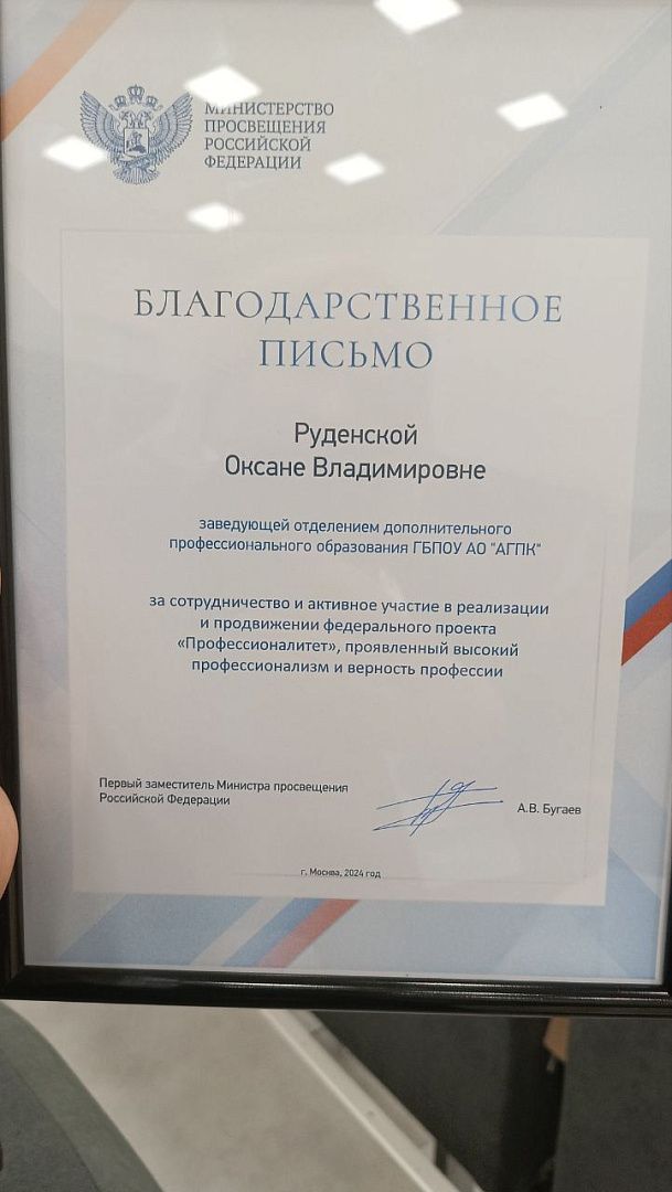 Оксана Владимировна была награждена Благодарственным письмом Министерства просвещения РФ за сотрудничество и активное участие в реализации и продвижении федерального проекта «Профессионалитет»!