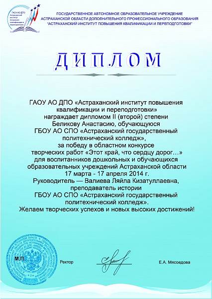 Диплом II степени – Беликову Анастасию (гр.ИС177)руководитель Валиева Л.К.