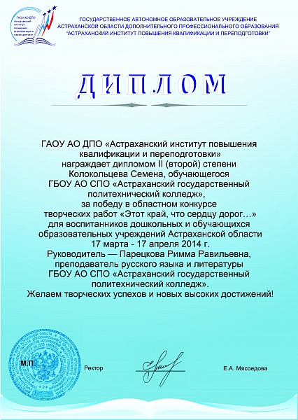 Диплом II степени – Колокольцев Семен (гр.СП111) руководитель Парецкова Р.Р.