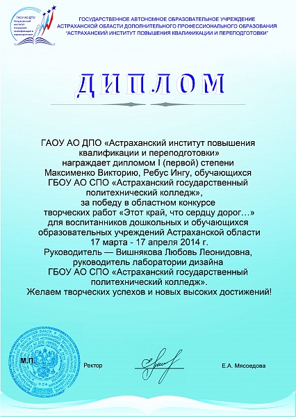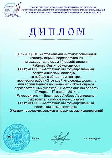 Поздравляем с победой студентов отделения ИТиД в областном конкурсе творческих работ «Этот край, что сердцу дорог….». Конкурс проводился на базе «Астраханского института повышения квалификации и переподготовки» с целью популяризации культуры, истории, традиций и самобытности народов, проживающих на территории Астраханской области, выявления и поддержки одаренных детей, активизации этнографической, исследовательской и краеведческой работы среди воспитанников дошкольных и обучающихся образовательных учреждений Астраханской области. Выражаем благодарность преподавателям и студентам, представившим свои работы для участия в конкурсе.