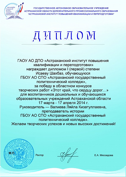Диплом II степени - Агаев Артем (гр.АТП120) руководитель Валиева Л.К.