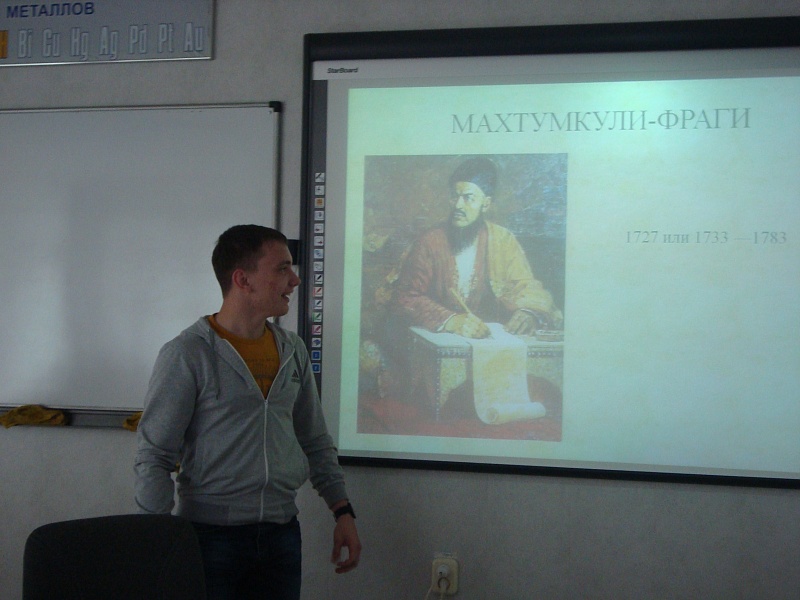 В группе РЭМ 141-9 механического отделения прошел классный час, посвященный жизни и творчеству великого туркменского поэта Мухтумкули Фраги. Студенты рассказали присутствующим не только о жизненном пути Мухтумкули, но и об Астраханском следе в судьбе мыслителя. Махтумкули Фраги посещал астраханскую землю несколько раз, начиная с 1760 года. Как высокообразованный и религиозный человек, он посещал медресе при мечети села Фунтово, учил детей арабской графике, ездил в расположенную в Астрахани мечеть. Оставил свои рукописи поэт и в библиотеке медресе мечети Фунтово-2.
