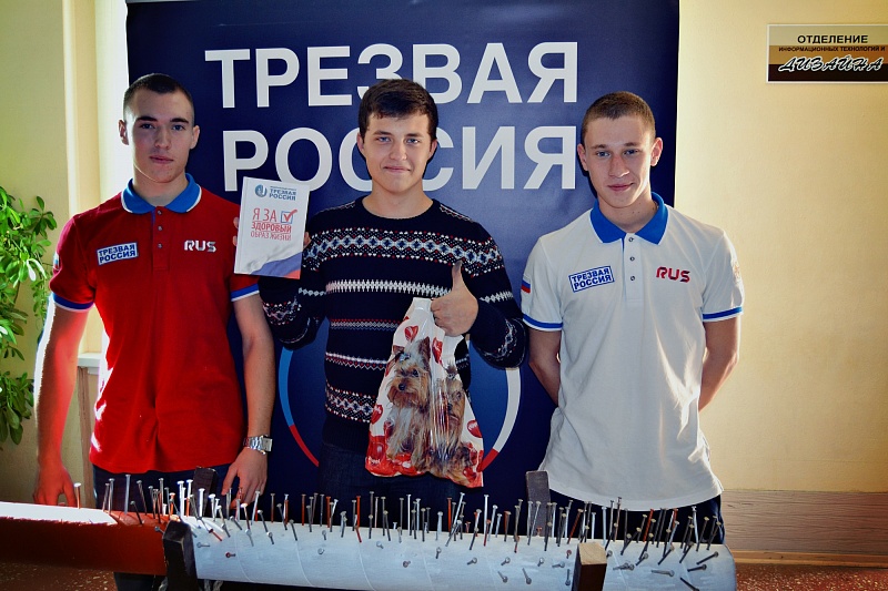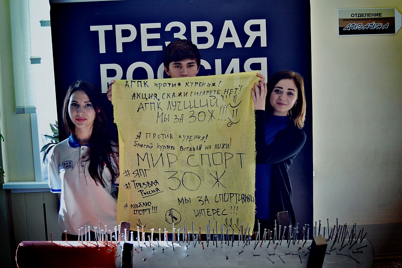 Координатор Федерального проекта «Трезвая Россия» по Астрахани и Астраханской области Светоченко Виктор, активисты Виноградов Сергей и Тимралиев Максим, совместно со студенческим активом колледжа предлагали курильщикам отдать сигарету и забить в импровизированную сигарету гвоздь, получив за это сладкий приз.