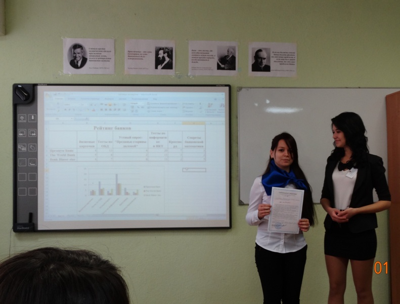 В ходе урока обучающиеся были поделены на 4 группы: банк 1, банк 2, банк 3, Центральный банк (аудиторы). Центральный банк, точнее его представители, проводили «аудиторскую» проверку всех трех банков, выявляя в течение урока их рейтинг. В ходе деловой игры «Кто хочет стать банкиром?» обобщены и систематизированы знания о законах банковской системы, о секретах банковской математики, о технологии расчета кредита с использованием электронных таблиц. Результатом работы банков и аудиторов стала – лицензия (разрешение на право осуществлять банковскую деятельность), которую аудиторы выдали каждому из трех банков.