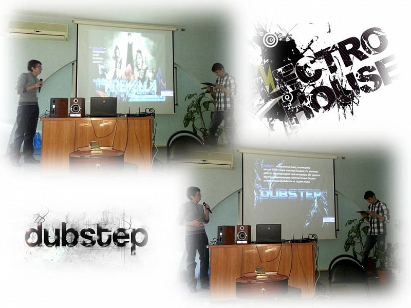 Электронная музыка оперирует звуками, которые образуются при использовании электронных технологий и электромеханических музыкальных инструментов. Сегодня электронная музыка включает в себя большое количество различных стилей от экспериментальной академической музыки до популярной электронной танцевальной музыки. О таких направлениях как Electro House и DubStep, об их наиболее популярных представителей рассказали Грязев Денис и Кустяев Артур.