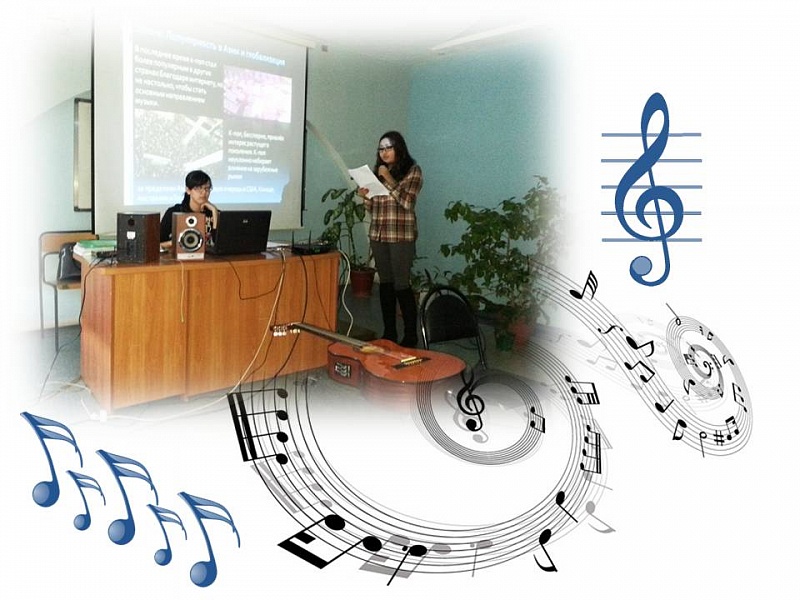 Этническая музыка – Анджаева Айса, Интенгенова Сауле рассказали присутствующим о корейской музыке. Современная южнокорейская музыка разделена на три основные категории: традиционная корейская народная музыка, популярная музыка, или К-поп, и навеянная западом малоизвестная музыка. Популярная музыка называется K-pop в английском языке, или каё (가요) в корейском. В современном K-pop преобладают танцевальные группы, состоящие из артистов с красивой внешностью и обладающих хорошими танцевальными навыками. На данный момент корейская музыка и звезды эстрады настолько популярны, что азиатами было придумано специальное слово - Халлю, означающее корейскую волну и отражающее влияние современной корейской популярной культуры на весь остальной мир.