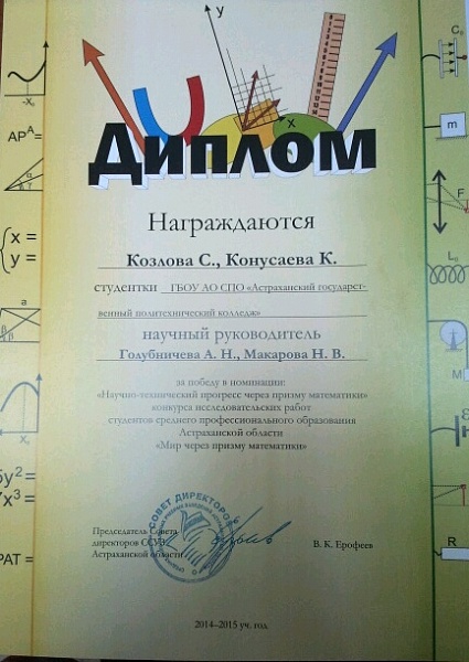 16 марта 2015г. в ГАОУ АО СПО «Астраханский агротехнический техникум» проходил третий, заключительный, этап конкурса исследовательских работ студентов среднего профессионального образования Астраханской области «Мир через призму математики».