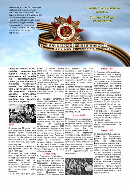 Завершился конкурс информационных плакатов, посвященных празднованию 70-летия Победы советского народа в Великой Отечественной войне. Предлагаем всем посетителям сайта ознакомиться с работами студентов группы ПИ277, выполненных под руководством преподавателя Лидии Алексеевны Крутовой.