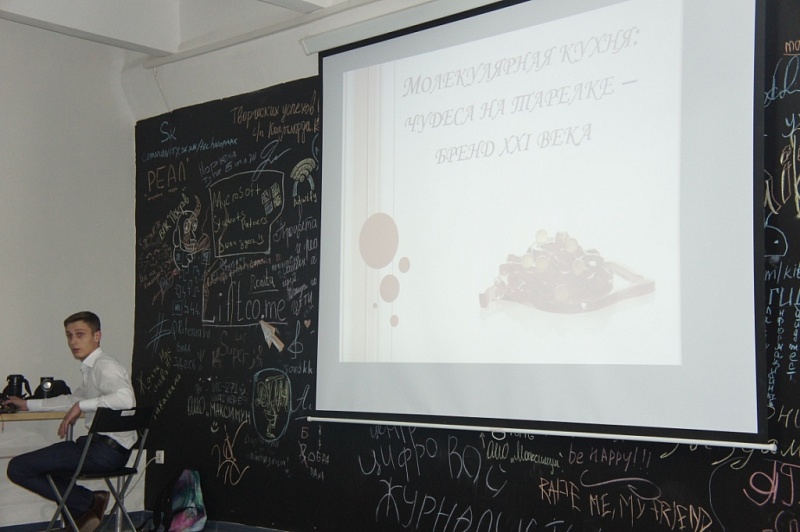 Студент отделения сервисных технологий Клубков Семен принял активное участие в первой встрече «Лектория Образовача: Курилки Гутенберга». Она состоялась в бизнес-инкубаторе «LIFT». С. Клубков выступил с докладом «Молекулярная кухня — химические опыты или кулинария».