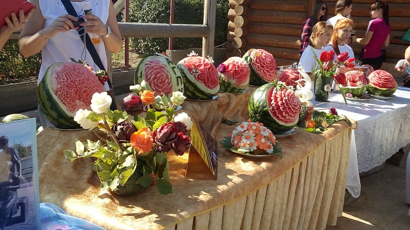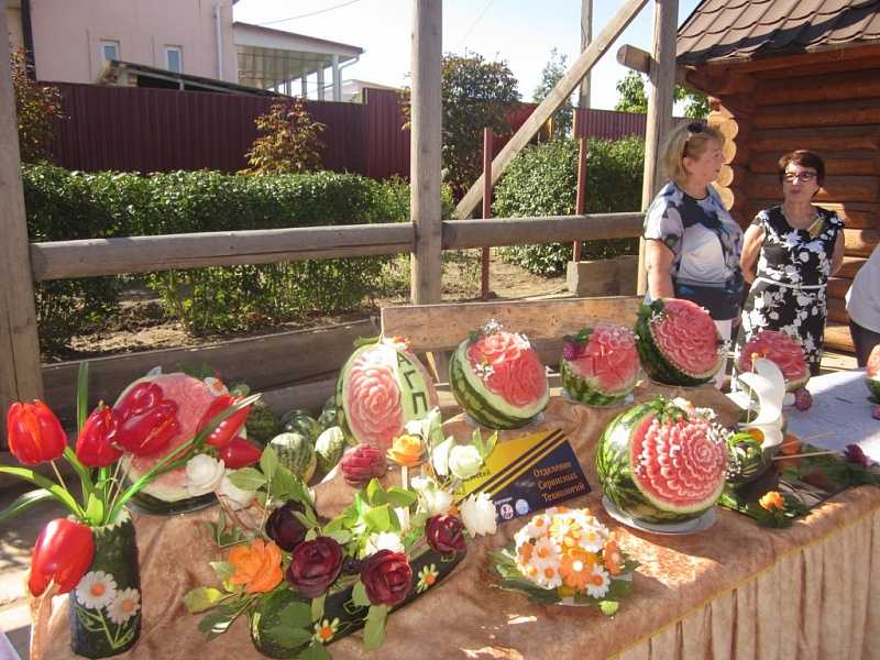 Студенты отделения сервисных технологий приняли участие в Международном туристическом проекте «Южный базар. Этноярмарка». Выставочная экспозиция по карвингу представлена продукцией астраханских полей. Розы из арбуза, тюльпаны из ярко-красных перцев, ладья из тыквы и многое другое – не полный перечень удивительных шедевром, созданных студентами и их руководителями Н.И. Латышевой и Т.А. Умеровой. Студенты группы ТП-382 продемонстрировали мастер-класс по карвингу, где обучали этому искусству астраханцев и гостей города.