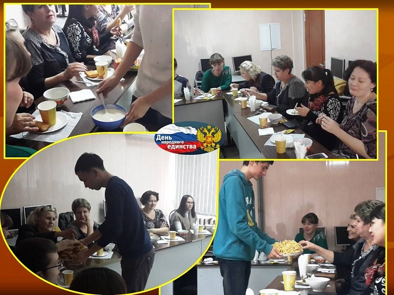 В завершении презентации каждая группа участников предлагала присутствующим отведать блюда национальной кухни: калмыцкий чай, казахские баурсаки со сгущенным молоком и сметаной, кавказскую долму, украинские вареники с картошкой и вишней, русский чай с блинами с клубникой и знаменитый татарский чак-чак.